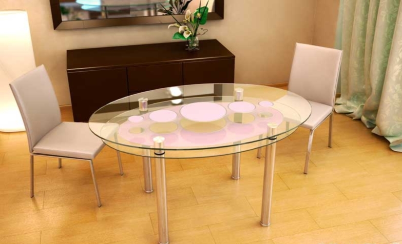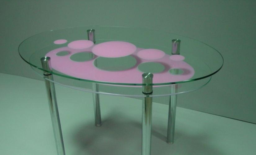 Столешница: прозрачное стекло, армированное цветной пленкой с эффектом 3D, толщиной 10 мм.